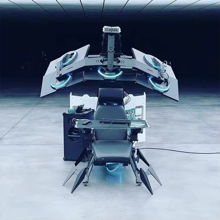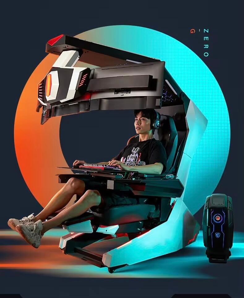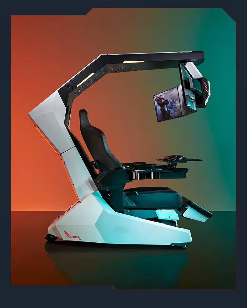 大型モニターアーム、調整可能なリクライニング、内蔵スピーカーやLEDライトなど、多彩な機能を搭載。