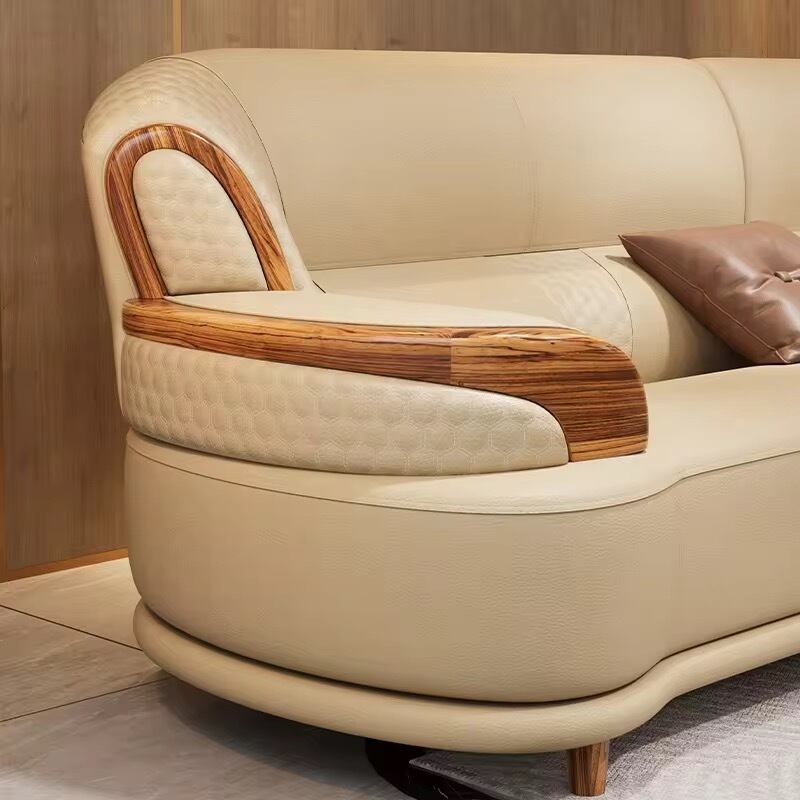 優雅な曲線と木目調アクセントが、リビングに洗練された雰囲気を演出。